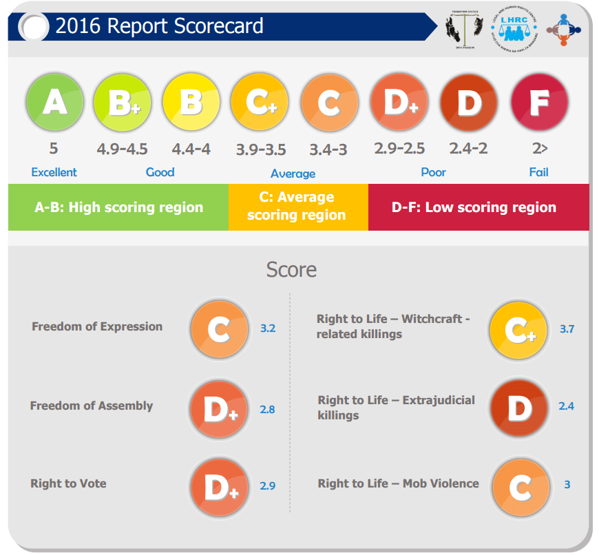 The civil and political rights situation in Tanzania has been graded a ‘C’ in 2016, with regions’ scores ranging from ‘failing’ to ‘good’. The index scorecard below outlines the scoring key and breakdown of scores for various Rights in the country overall. Among local experts across the country, extrajudicial killings are considered a key issue affecting right to life, and the protection of citizens’ freedom of assembly and right to vote is perceived to be poor. The report provides useful analysis on key indicators and highlights key regions and rights to watch in 2017.