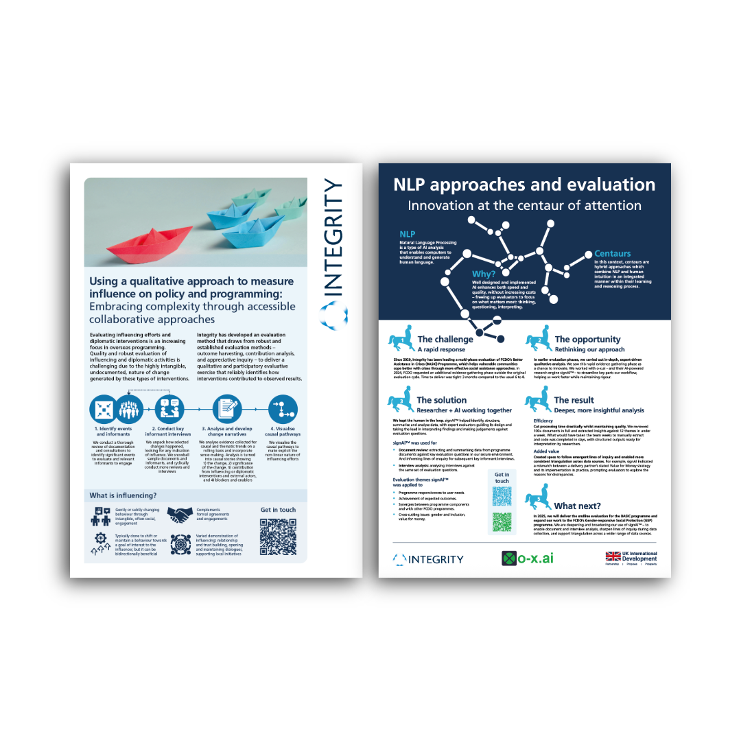 We offer ethically informed, expert and complementary services across a range of thematics and geographies. This three-dimensional approach enables us to tailor our offer to best meet our client needs and uphold high standards of delivery.