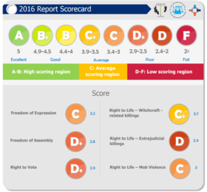 The civil and political rights situation in Tanzania has been graded a ‘C’ in 2016, with regions’ scores ranging from ‘failing’ to ‘good’. The index scorecard below outlines the scoring key and breakdown of scores for various Rights in the country overall. Among local experts across the country, extrajudicial killings are considered a key issue affecting right to life, and the protection of citizens’ freedom of assembly and right to vote is perceived to be poor. The report provides useful analysis on key indicators and highlights key regions and rights to watch in 2017.